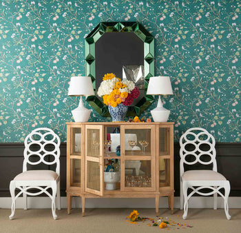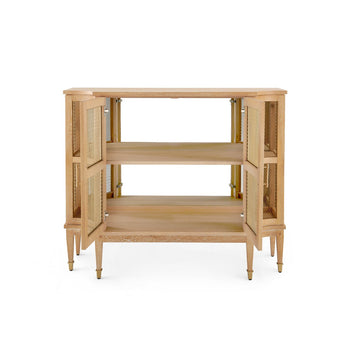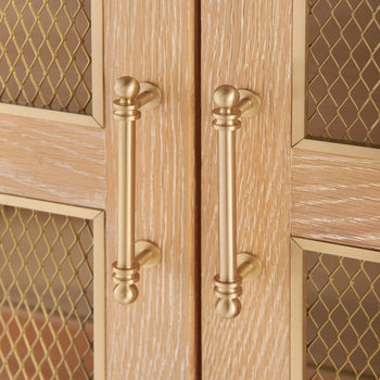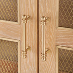 A somewhat rustic, French-inspired cabinet, the Rene comes in two colorways: a natural cathedral-grained cerused oak and a light gray cerused oak. Villa & House's signature cerused oak process adds a white contrast to the fine details of a wood's grain, enhancing the beauty and delicate natural patterns of lumber. The wire grill evokes pastoral glamour, finished in gold. The coordinating brushed brass sabots, or furniture feet derived from the French word for shoe, further elevate the piece. The Rene Cabinet is best used in a living room, dining room, entryway or a large kitchen, holding your china, glasses, or bottles of wine, with 12.9-inch tall shelves that are large enough for carafes or decanters. The elegant, deceptively narrow side view is around 18.5 inches, while the overall height is around 42 inches, harkening back to old-world dining rooms of French estates, or picturesque European kitchens in a country home. Drawing from romantic, old-world design, the Rene Cabinet is equally appropriate in a coastal pied-à-terre, southern home, or perched in front of an exposed brick wall in a Tribeca loft. 50W x 18.5D x 42H