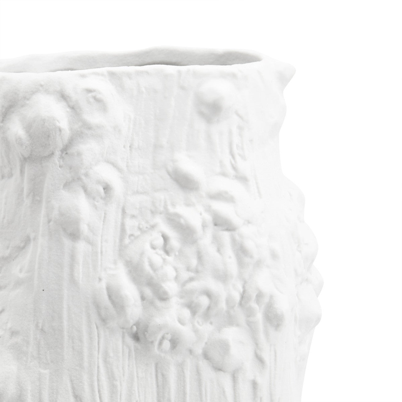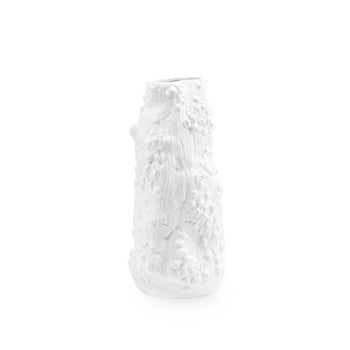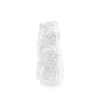 The Saorise vase is one of several new vases that takes it's inspiration from forms encountered in the natural world. Borrowing from coral reefs, to forests, to natural rock outcroppings, our artisans have created vases in white matte porcelain that celebrate the beauty and the asymmetry forms encountered in both land and sea. The Saorise Large Vase recalls a tree trunk in the forest with all the little growths and knobs that would naturally occur stunning in their originality, these pieces serve either decorative objects, for example gracing center table or a dining table, or as vases holding floral arrangements. 8W x 8D x 17H