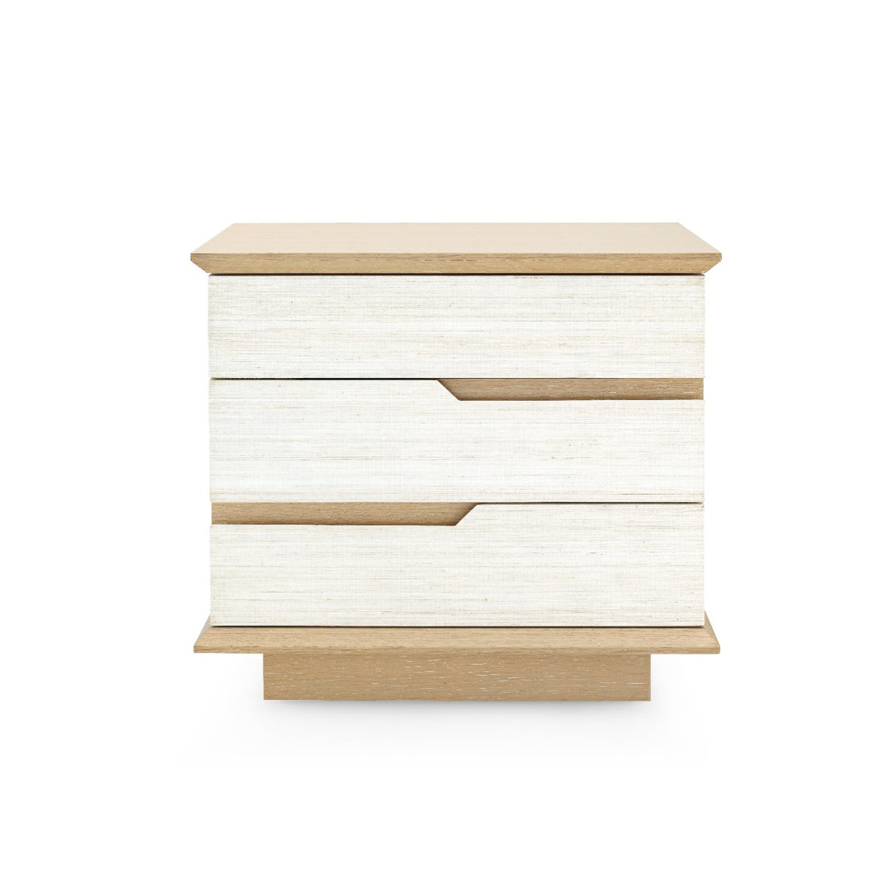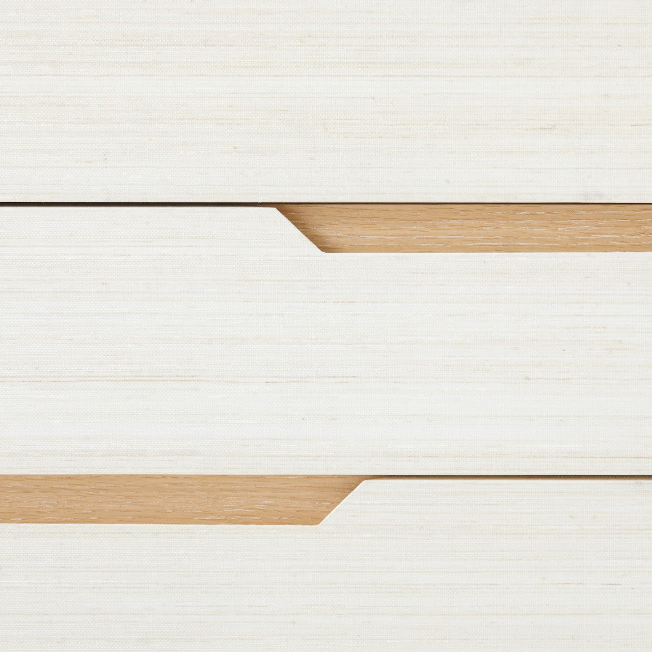 Crafted from solid oak, the Simon Side Table exudes a timeless elegance that will captivate your senses. The organic grain patterns and rich hues of the wood create a warm and inviting ambiance, while the Clear Lacquered Silky Grasscloth adds a touch of refined texture. Designed to make a statement, this side table sits proudly on a platform base of Cerused Oak, showcasing its sleek and modern silhouette. The cutouts, cleverly integrated into the design, not only serve as pulls for the drawers but also expose the same beautiful wood, creating a harmonious and seamless aesthetic. With its low-to-the-ground profile, the Simon Side Table functions perfectly as a side table or a small media console. 24.25W x 17.75D x 21.75H