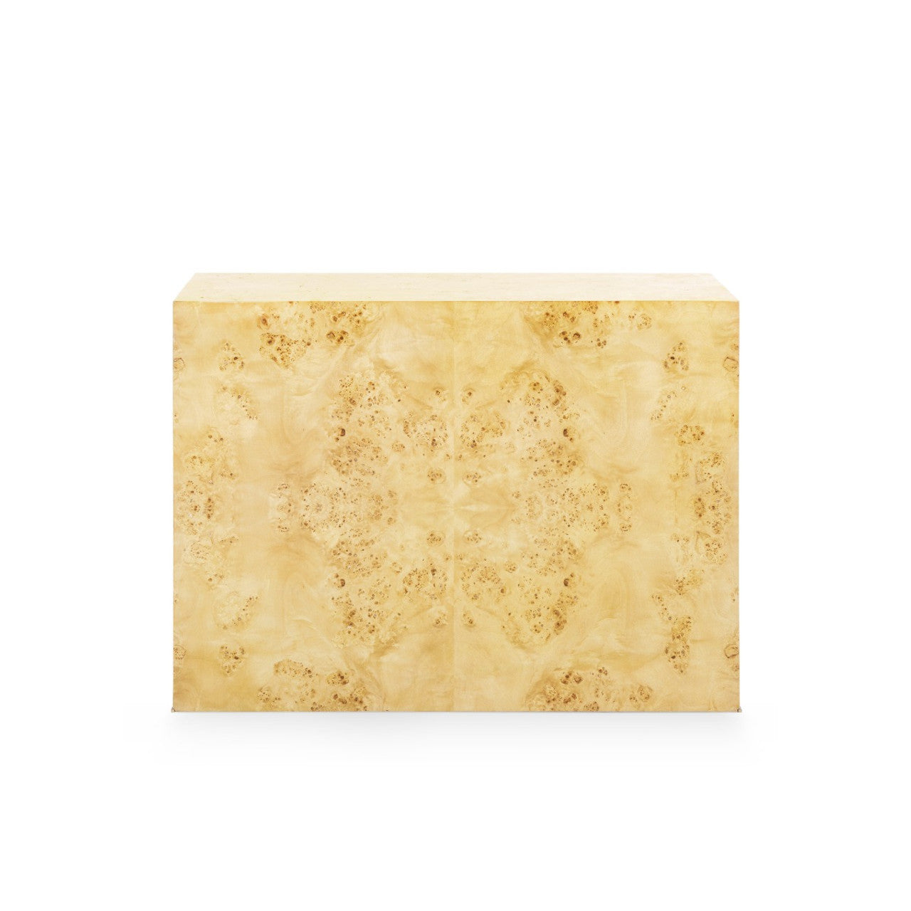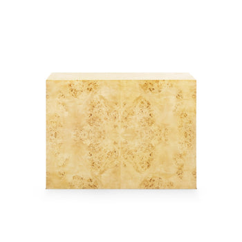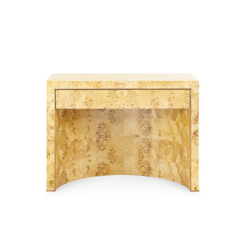 The Sloane 1-Drawer Side Table is the epitome of timeless cool inspired by the iconic '60s-'70s era. Meticulously handcrafted from exquisite burlwood, its curved back and brushed brass border exude luxury. Its ample width invites creative styling, making it an impeccable choice as a nightstand, side table, or a statement piece for an entryway. Elevate your space with this elegant piece that seamlessly blends nostalgia with modern style. 40W x 18D x 30.25H
