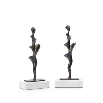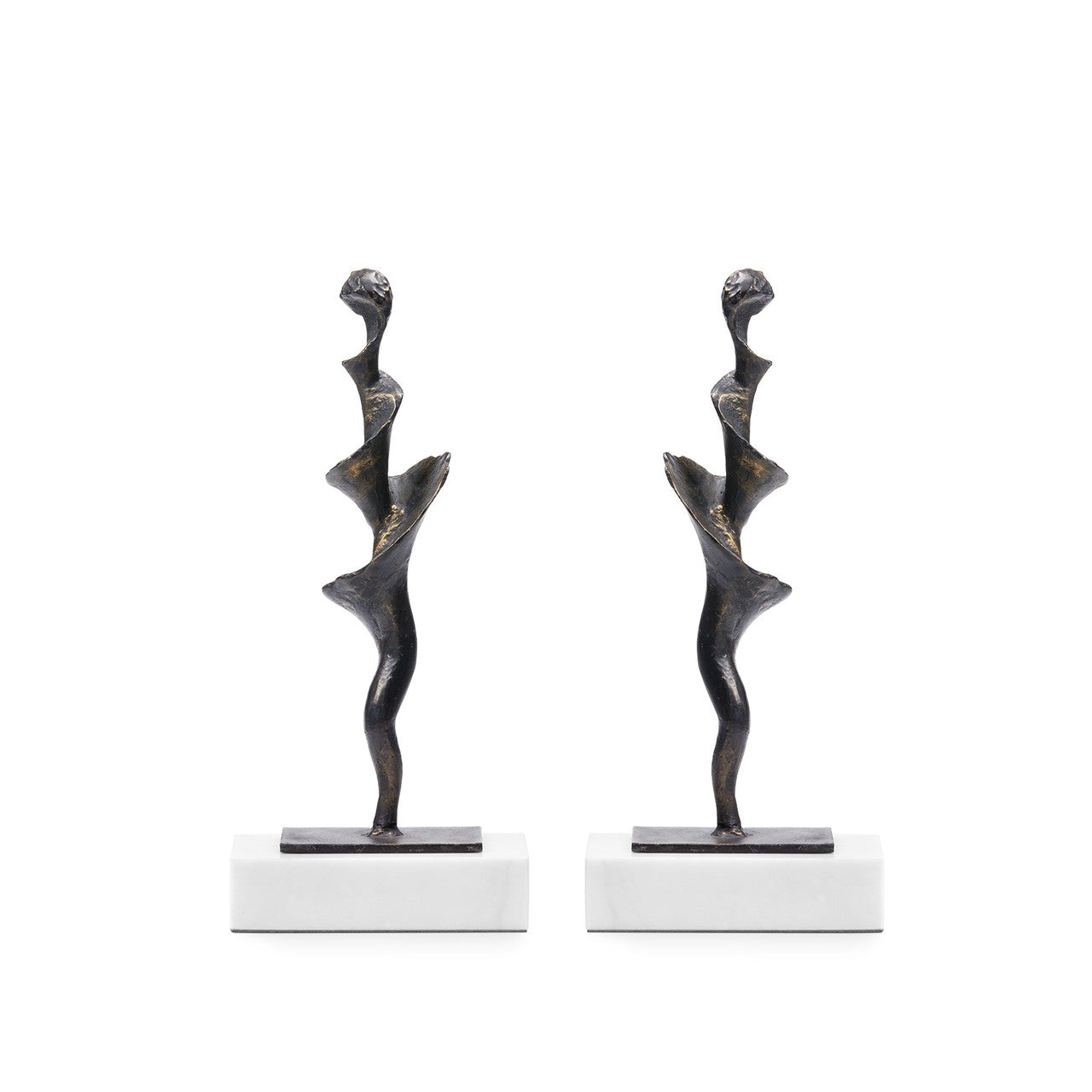 These abstract bronze-finished iron statues are influenced by the natural elements of the ocean. Our artisans sand-cast each piece giving the Spiral Statue an earthy texture and the shape of an eroded conch shell on the shore. A beautiful organic form that disappears over time but is rendered in a durable material to take on a more substantial presence. Its white marble base makes it perfect for display on your bookshelf, console, or in your home office. Sold in a set of 2, these statues will balance any living space gracefully. 5.75W x 2.75D x 13H