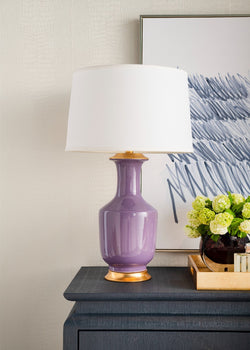 The Thalia Lamp embraces classic luxury with a bit of whimsy thanks to its fresh pastel coloring, softening even the most traditional of decor schemes with a dash of springtime charm. Its silhouette is inspired by Chinese pottery, featuring a long, elegant neck which slopes down to meet its full-bodied lower half. The Thalia's graceful curves come to life in gorgeous, glazed porcelain, rendered by Villa & House's expert artisans and finished with a glossy sheen that plays up its light lilac hue. Its simplified shape, which nods to the rotating vases that originated in the Qianlong Dynasty, reflects more modern tastes while a gold-leafed base and finial provide a treasure-like richness akin to an antique. Pair a set across two nightstands or on either end of a long console. The Thalia Lamp radiates cool and cozy wherever it stands. Top it off with one of our signature lamp shades, sold separately. 6W x 8D x 30H