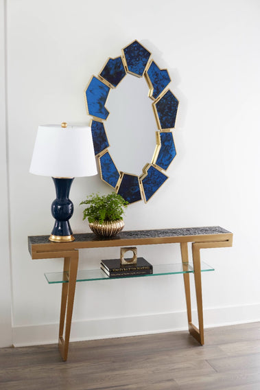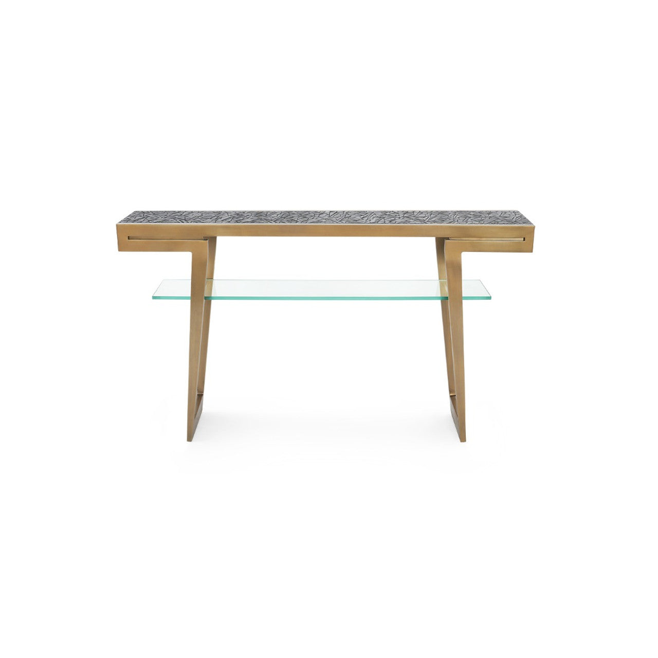Make a bold statement with the Zelda Console, a masterpiece of modern metalwork. Crafted with antique brass sides and legs, complemented by a captivating textured Sable Bronze finish top, this console radiates an aura of refined glamour. Its sleek geometric shape and slender profile embrace a modern aesthetic, while the inclusion of a glass shelf seamlessly merges functionality with style. 51.5W x 9.25D x 30.25H