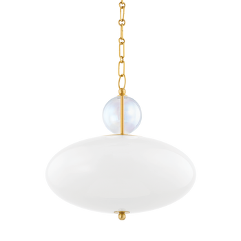 Iridescence has seen a resurgence in fashion and beauty so it's no surprise that design is the next frontier. This delicate, totem-style pendant is suspended from an aged brass chain, featuring an iridescent globe accent and opal glass shade. Full of vintage appeal, the Viviana Pendant brings old world charm to the everyday.