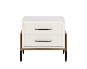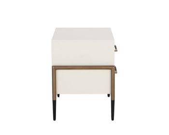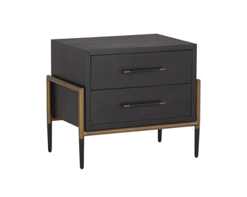 Make a statement with this stylish nightstand that exudes prestige. Features a oyster acacia wood veneer with two soft closing drawers. Completed with powder-coated black and antique brass iron handles with a coordinating base. As wood is an organic, porous material, these pieces will contain natural variation of texture and may also exhibit fine indentations and cracks. Wood pieces will also display a disparity of colour and grain, and visible knots and burls that add to the character of each piece.
