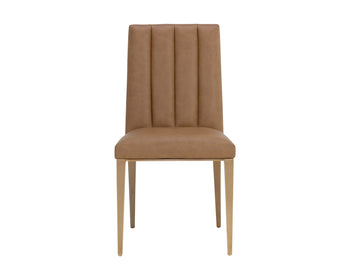 Minimal and classic best describes the Wilbur Dining Chair. Upholstered in milliken cognac faux leather with vertical channeling on the back seat for added flair. Finished with powder-coated stainless steel legs and a matching handle. Handle With Care: This design has been crafted with faux leather. Faux leather is manufactured to reflect the natural characteristics of leather; as such, colour variations, markings, wrinkles, grooves, and light scratches are appreciated characteristics. No two pieces will be alike. Visit our Product Care page for more information on how to ensure the lasting beauty of this piece.