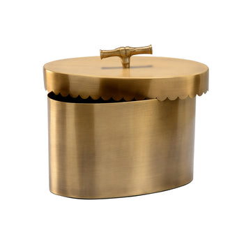 Buttercup Brass Box, from the Cheryl Luckett collection for Wildwood, exudes southern charm with its graceful, scalloped edge and warm antique brass finish. A bamboo inspired handle and removable lid allow access for storage.