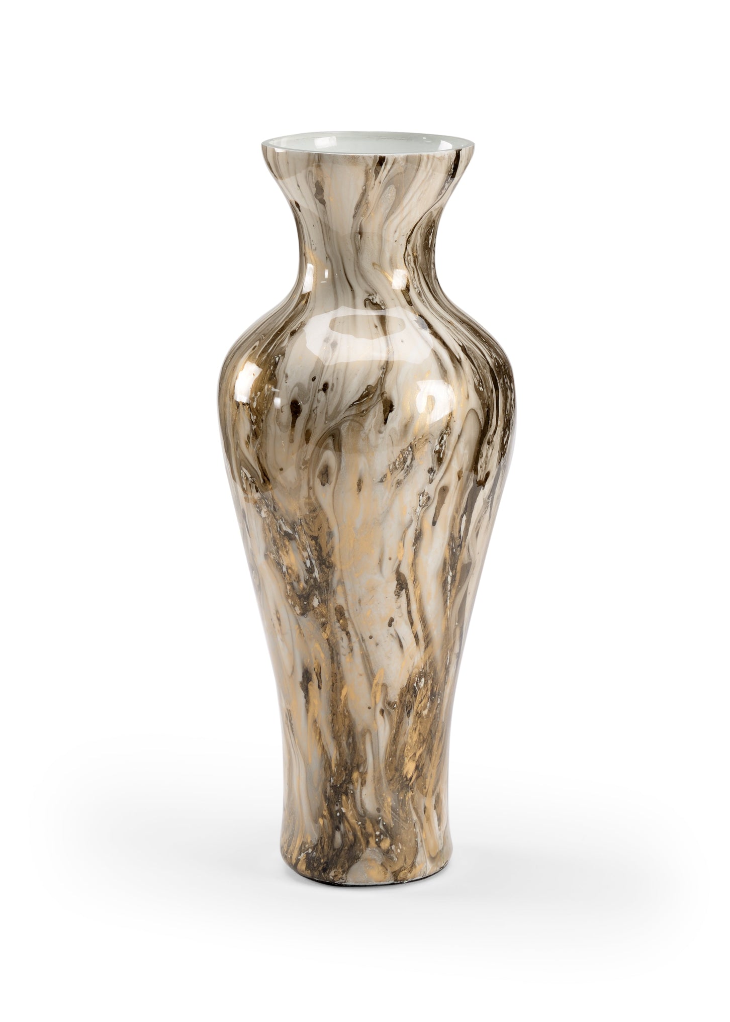 Be mesmerized by the swirls of the calacatta gold... Cream, gray and gold create a marbled pattern on this striking 20" glass vase. The graceful curves of the vase along with the swirls of the calacatta gold add visual interest and a sense of calm to any environment. Add fresh flowers for a stunning centerpiece.