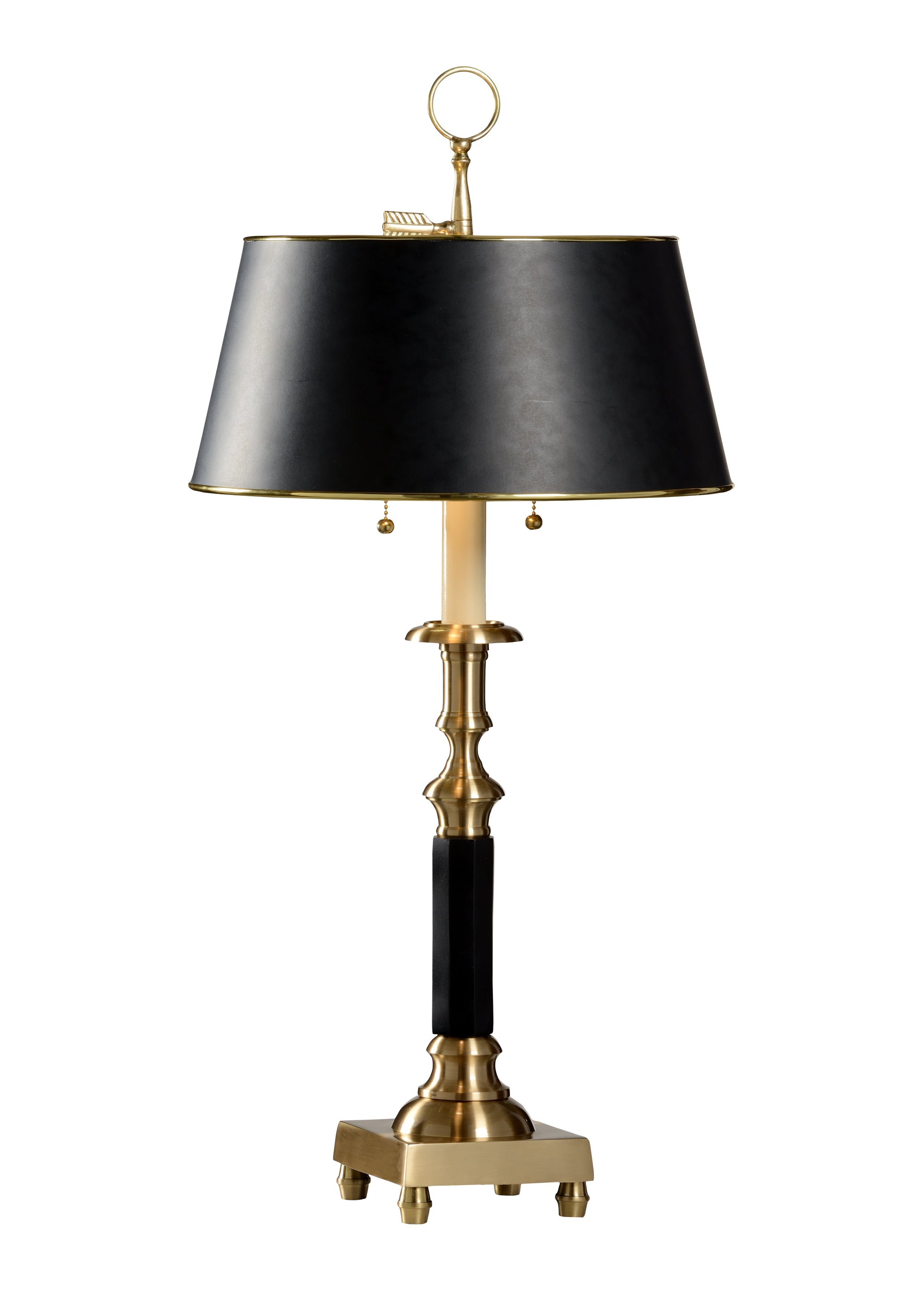 Illuminate your study with this traditional hand finished cast brass candlestick lamp. This classic table lamp features two lights with brass pull chains that are both decorative and functional. A black parchment shade with tortoise shell interior completes this timeless design.