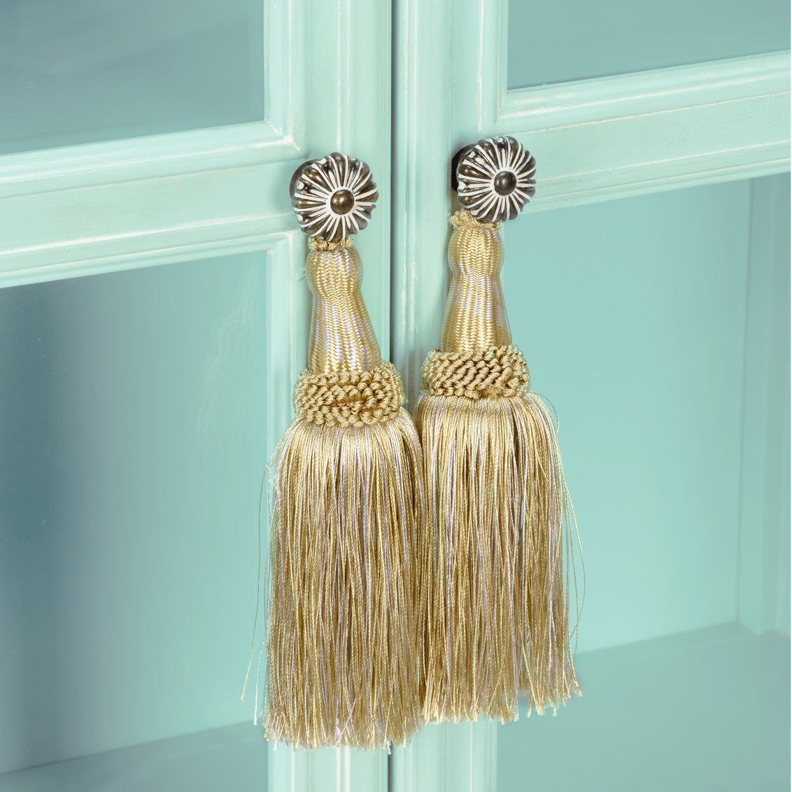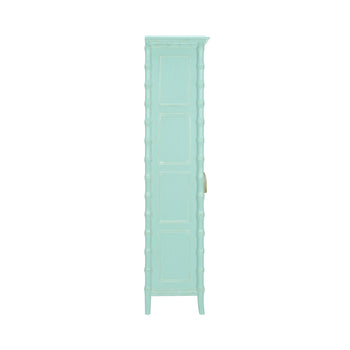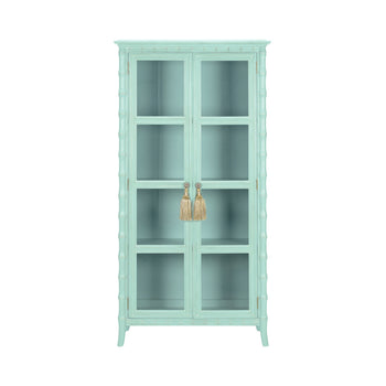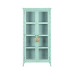 Cape Cod Linen Cabinet is crafted of wood and features a stylish bamboo design with a whitewashed finish. Two clear glass doors open to reveal four wooden shelves for storing linens or displaying your favorite decorative accessories. The round whitewashed bronze door pulls are adorned with a set of gold tassels that add a feminine feel to the design. Not intended for clothing storage.