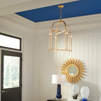 Diego lantern is a simply elegant chandelier with a hammered gold leaf finish that will elevate any design. The transitional open frame design features four electrified candles that allow perfect accent lighting to shine throughout hallways, stairways, foyers, kitchen and dining areas.