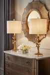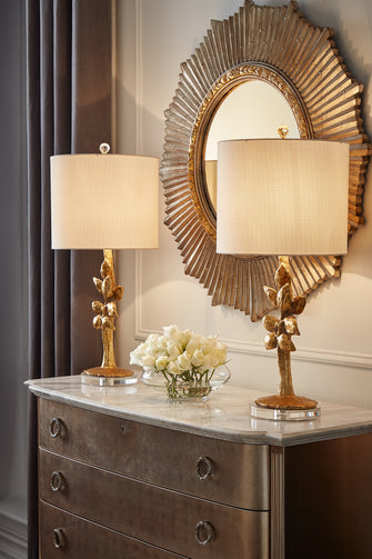 Refresh your decor with this nature inspired light feature. The gold leaf finish on the textured cast composite sculpture of leaves emits a lustrous glow under the eggshell linen drum shade. An acrylic base and finial give a hint of elegance.