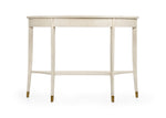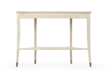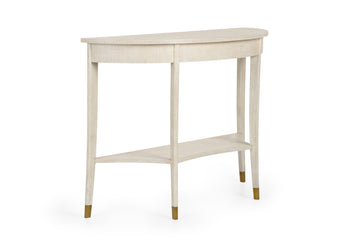 The Oaklee Collection features solid, hand finished cerused oak which highlights the texture of the natural wood grain and its rustic modern appeal. The console has antique brass leg caps that add an upscale touch. The demilune shape makes it ideal for a tight hallway or entryway.