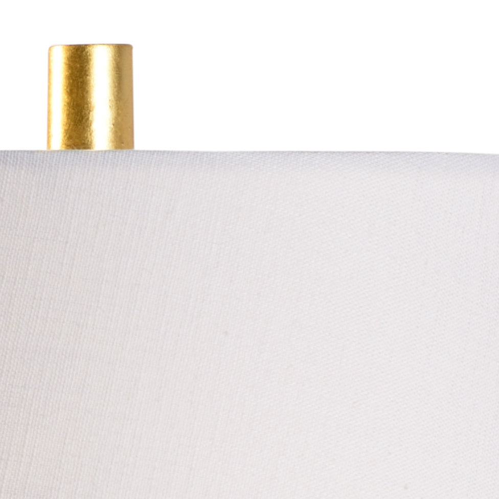 Sigrid lamp features a transitional design that blends effortlessly in any space. A robin's egg blue glaze is applied to a modern gourd shaped ceramic vase that sits atop a warm gold leaf steel base. An off white linen shade adds elegance and provides direction for the opulent light to shine throughout the room.
