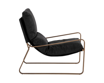 Unwind in comfort with this incredible lounge chair that features a stylish scooped seatback. Upholstered in tan leather and completed with a gunmental steel frame. Handle with Care: This design has been crafted with 100% genuine leather. Leather is a natural material; as such, colour variations, markings, wrinkles, grooves and light scratches are acceptable and appreciated characteristics. No two pieces are alike. Visit our Product Care page for more information on how to ensure the lasting beauty of this piece. Made in India. With refined craftsmanship, this design was brought to life by skilled local artisans. Due to the nature of handcraftsmanship, unique imperfections such as fissures, markings and variations in colour and shape are welcomed and appreciated characteristics for a truly one-of-a-kind piece.