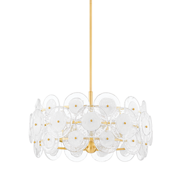 An elegant reimagining of the classic drum shade silhouette, this dazzling chandelier features discs of clear cast glass, each with an opaque Blonchino at the center, layered around a three-tiered Aged Brass ring framework. The glass discs have a metal accent in the middle and vary in size, creating visual interest and a lighting effect that feels simultaneously glamorous and warm.