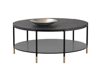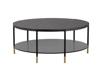 An alluring coffee table. Features a concrete top with a black/charcoal soft slate effect and a black tempered glass shelf. Finished with sleek black steel legs with brushed gold foot caps.