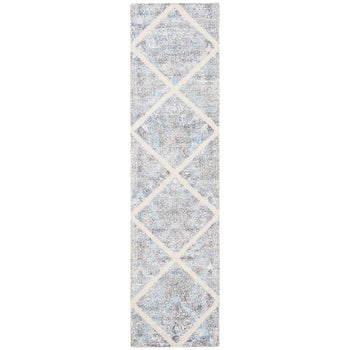The rug's design features a sophisticated pattern that seamlessly blends ivory and gold hues, creating a chic foundation for your decor. The geometric motifs add a contemporary flair, while the distressed finish lends an air of antique sophistication. Versatile and attractive, this runner is more than just a floor covering?it's a statement piece that will complement a range of interior styles.