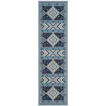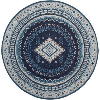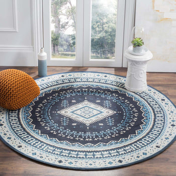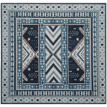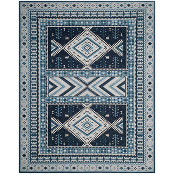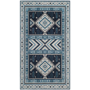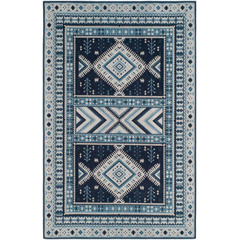 Elevate your living space with our exquisite 3' X 5' Small Rectangle area rug, boasting a harmonious blend of navy and light blue hues. Carefully constructed in India through a Power Loomed technique, this rug exhibits a profound level of craftsmanship and durability.