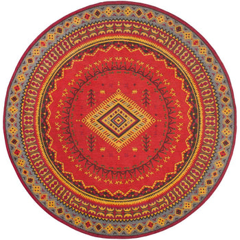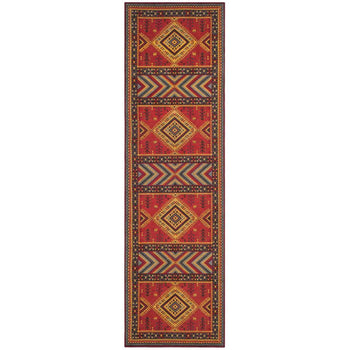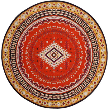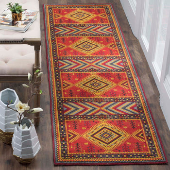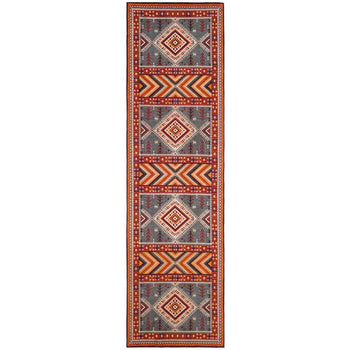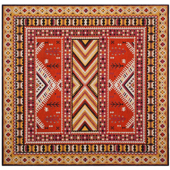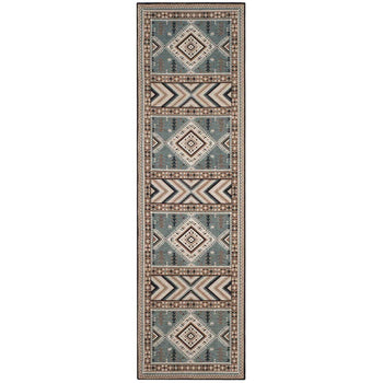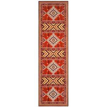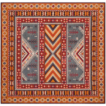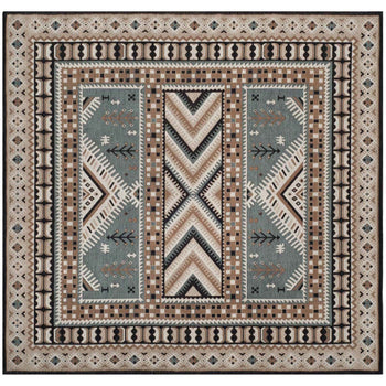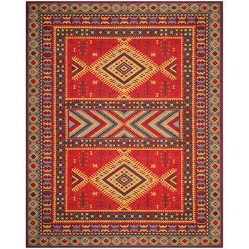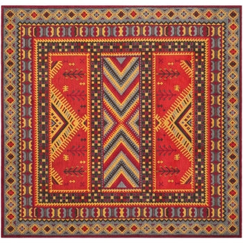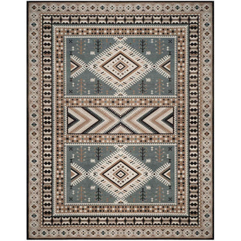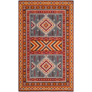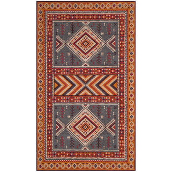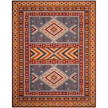 With a pile height of 1/2", the rug achieves a perfect balance between plush comfort and ease of maintenance. Its intricate patterns, as depicted in the image, showcase a dynamic array of geometric motifs and tribal-inspired designs, each woven with precision to create a visual narrative across the rug's surface.