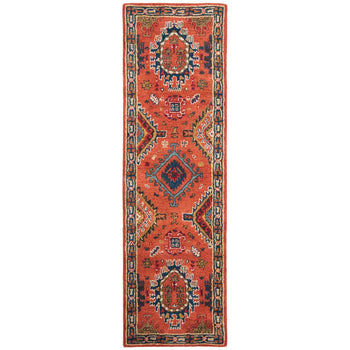 Crafted with meticulous attention to detail, this runner rug boasts a plush pile height of 3/8" for a soft underfoot experience. The intricate pattern depicted in the image infuses your home with a classic yet bold design, featuring dynamic geometric shapes and a harmonious blend of rust reds and deep navy blues, complemented by touches of ivory, green, and gold tones.
