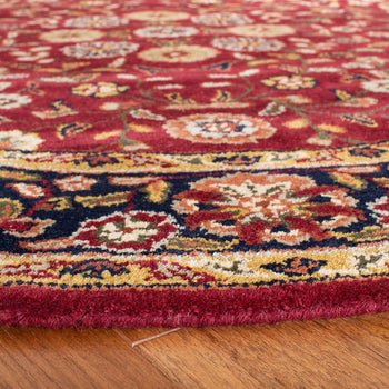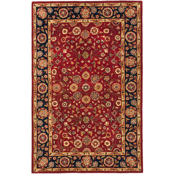 Drawing inspiration from classic designs, the area rug boasts a rich red field complemented by a sophisticated navy border, creating a stunning contrast that captures the eye. The intricate floral and geometric motifs echo the heritage and craftsmanship of traditional rug-making, while the plush wool construction ensures durability and comfort underfoot.