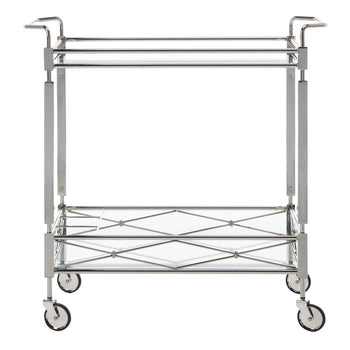 Imbibe in style with this sleek 2 tier rectangle bar cart. Inspired by the decadence of Art Deco design, its luxurious layers of glass and chrome are perfect for displaying drinkware, beverages and accessories. It brings a sophisticated touch to any room.