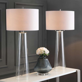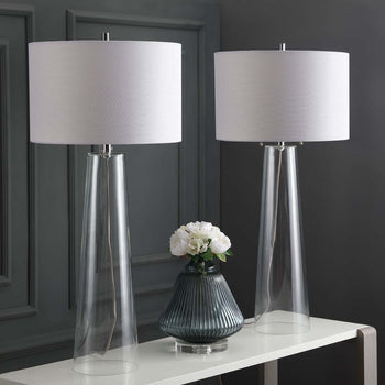 The posh interior design of London's latest boutique hotel inspired this stunning glass table lamp (set of 2). Boasting a clear statuesque figure, it brings instant cosmopolitan style to any room with its cool chrome finish and crisp off white shade.
